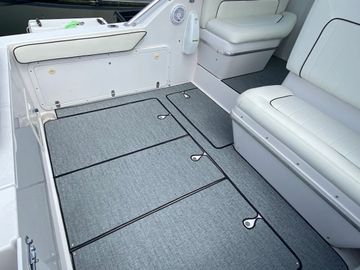 Go the extra length for comfort and style, ask about our plush or rugged Marine flooring options. Featured in this photo in Marine max Woven vinyl flooring in a custom layout designed by us.